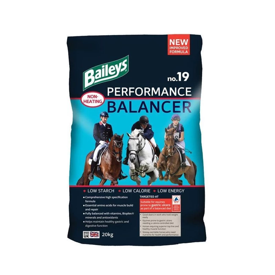 A Baileys No.19 Performance Balancer egy magas hatóanyag-tartalmú, pellet formájú balancer munkában lévő lovak és pónik számára. Olyan lovak igényeire fejlesztették, amelyek könnyen tartják a testsúlyukat, de a munkaterhelés növekedésével fokozott tápanyag-ellátásra van szükségük. Ajánlott továbbá gyomorfekélyre hajlamos, kalóriakímélő étrendet igénylő lovaknak, azoknak, akiknél fontos az erős felső vonal és az egészséges izomműködés fenntartása, valamint idegesebb, feszültebb típusú lovaknak, amelyeknek extra támogatásra van szükségük a teljesítményhez.