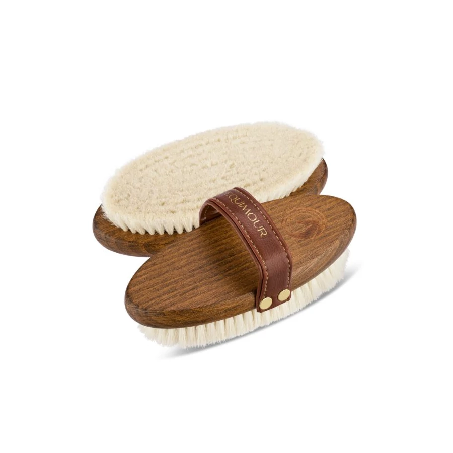 Az Equimour kecskeszőr fényező kefe „MO” tökéletes választás lovasok számára, akik különös hangsúlyt fektetnek a gyengéd és hatékony szőrápolásra. Extra finom kecskeszőr sörtéivel még a legfinomabb port is eltávolítja, és ragyogó fényt kölcsönöz lova bundájának – teljesen statikus feltöltődés nélkül.