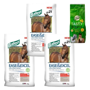 GYOMORFEKÉLYES TRIO CSOMAG: Baileys No.21 Ease & Excel Mix alacsony keményítőtartalmú lótáp, gyomorfekélyes lovaknak (müzli) + AJÁNDÉK: Tasty Treats jutalomfalat