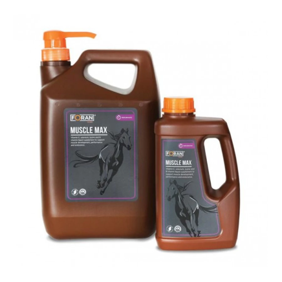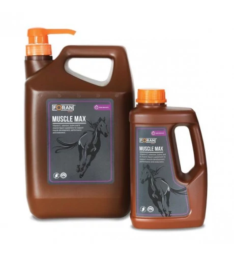 A Muscle Max L-lizint, E-vitamint, szelént és B-vitaminokat tartalmazó ízletes, folyékony takarmánykiegészítő az izmok fejlődésének elősegítésére fiatal vagy gyenge kondíciójú lovak részére. A lizin esszenciális aminosav melyre a csont-, és izom fejlődés igényei miatt van szükség. Az E-vitamin és a szelén antoxidánsként védenek a sejt károsodásokkal szemben. A B-vitaminok pedig a sejtek optimális fehérje-, és az energiahasznosítását segítik elő.