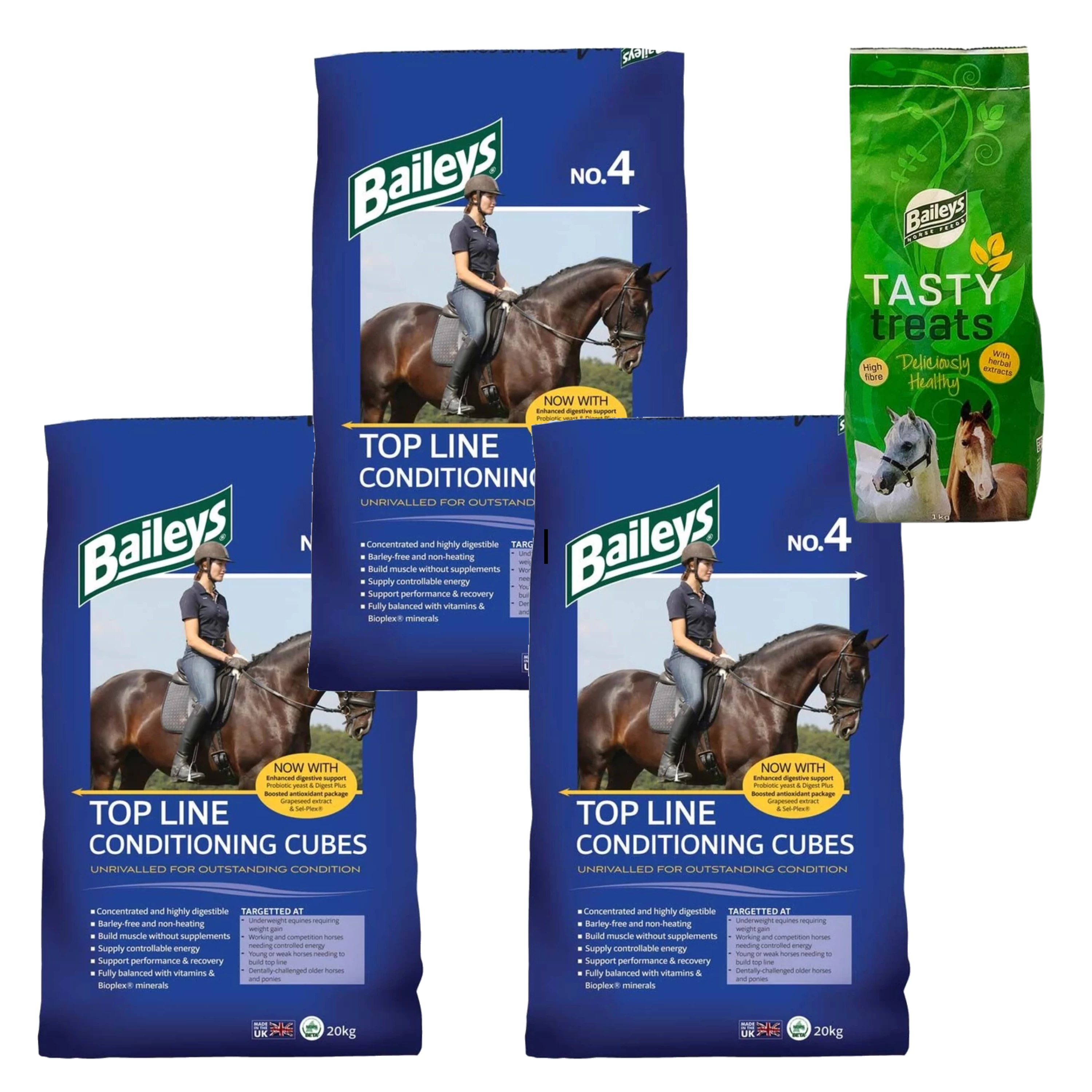 A Baileys Top Line Conditioning termékei méltán népszerűek a lótápok piacán, hiszen olyan - mikronizált búza alapú, könnyen emészthető, zabmentes - készítmények lovak és pónik számára, amelyek önállóan biztosítják az abraktakarmány-szükségletet. Kiváló minőségű fehérjéket tartalmaznak az izomzat épülése érdekében, a hozzáadott szójaolaj pedig lassítja az energia leadását, miközben az omega 3 és 6 zsírsavak antioxidánsokkal támogatva hozzájárulnak az egészséges megjelenéshez anélkül, hogy a lovat "túlfűtenék". Akár Cubes (pellet), akár Mix (müzli) formájában használod, koncentrált formulájának köszönhetően kis mennyiségekkel is nagy eredményeket érhetsz el!